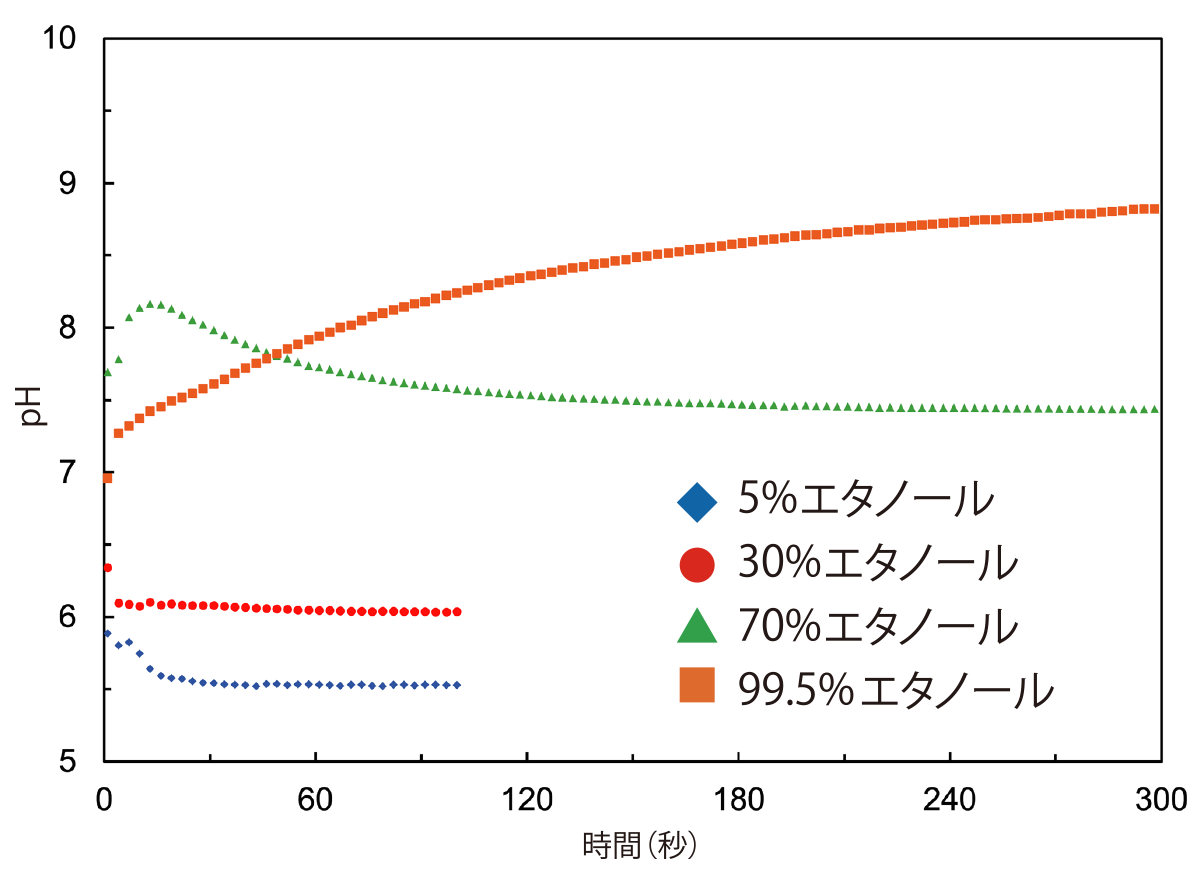 9615S-10D、9681S-10Dを標準液pH 4.01とpH 6.86で2点校正を行い、30%エタノール※4を100秒間測定しました。測定は25.0℃条件下で攪拌状態で行いました。