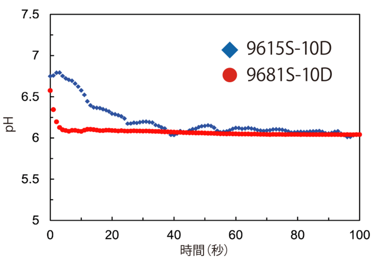 実験1の結果を図1に示しました。9615S-10D、9681S-10Dともに最終指示値は同程度でしたが、9615S-10Dは値が安定し始めるまでに50秒程度要し、測定終了時まで常時指示値のふらつきがみられました。これに対して、9681S-10Dは浸漬後10秒程度で値が安定し始め、またその後もふらつきはほとんどなく安定し続けました。9681S-10Dの安定した結果は、液間電位が発生しにくい構造の効果によるものと示唆されます。