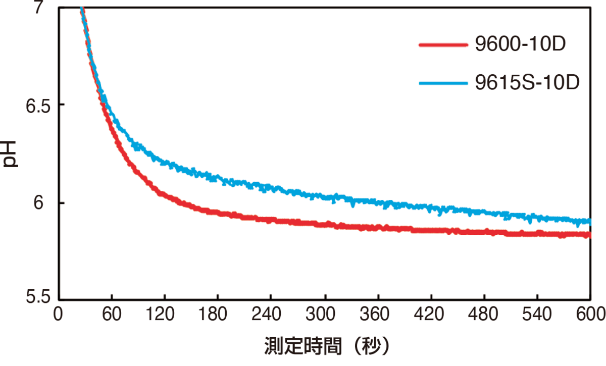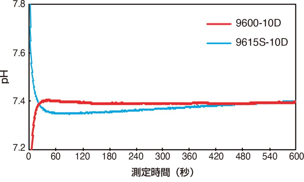 そこで、純水を測定する際にpH電極からの流出物質の影響が少ない9600-10D※2を用いることで、値のふらつきを抑えられ、応答性の良い測定が可能となります。