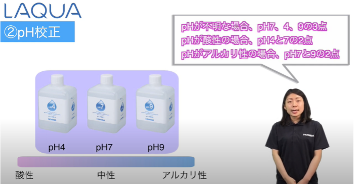 pHの校正はサンプルのpHを挟み込む2点以上の標準液で行うことがポイントとなります。