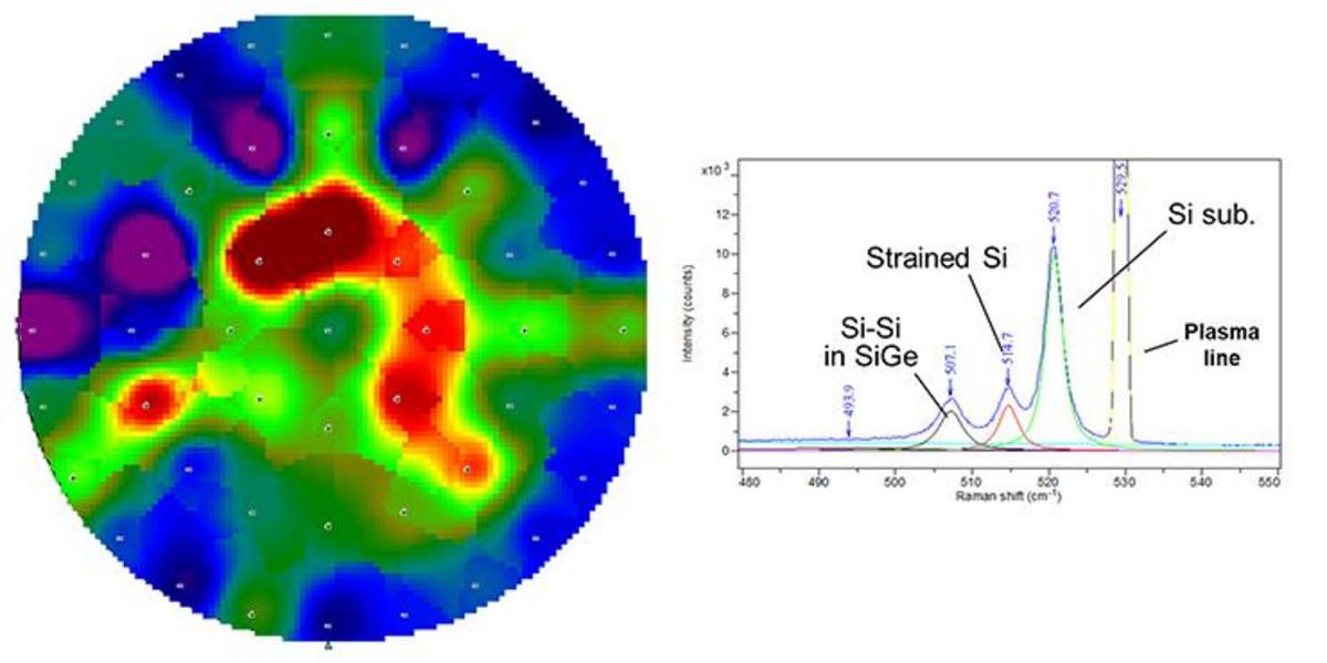Stress distribution map derived from Raman data of a strained silicon layer on SiGe; Representative Raman spectrum