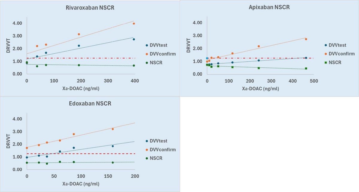 DVV test/DVV confirm showed different sensitivity to Xa-DOAC. For all Xa-DOAC spiking, NSCR remained below positivity cut off as concentration increased (Figure 1).