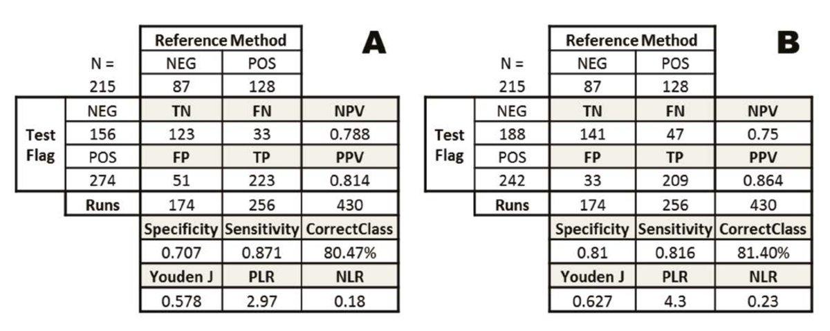 Table 1: Performance of malaria suspect flag on Pentra XLR using CBC and DIFF mode. The number of true negative (TN), false negative (FN), true positive (TP) and false positive (FP) results are determined for flagging on duplicate analysis. Statistical analysis for negative predictive value (NPV), positive predictive value (PPV), positive likelihood ratio (PLR); negative likelihood ratio (NLR), Youden J index with correct classification rate with specificity and sensitivity are good for both A, malaria vs. all negative samples (normal and dengue fever) and B, malaria vs. normal samples.