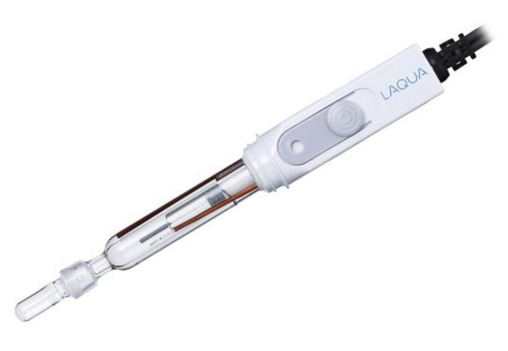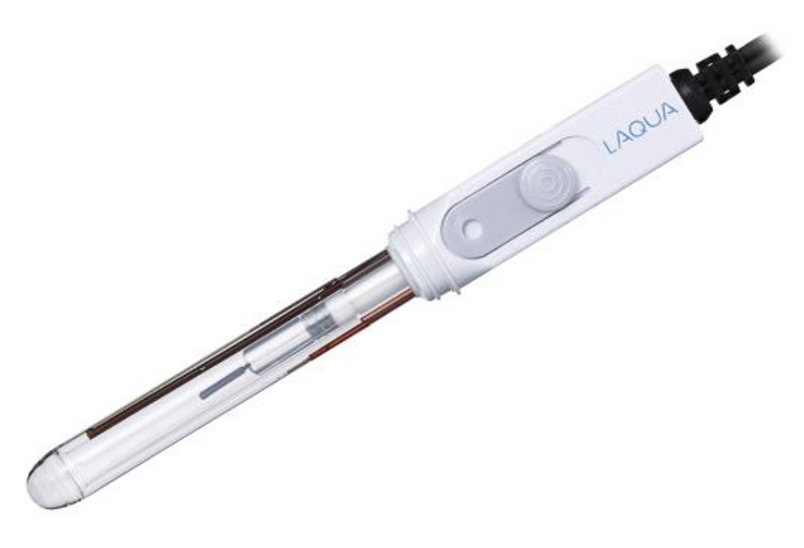 pH measurement of a solution using a glass electrode works by measuring the potential difference generated between a glass electrode and a reference electrode across a liquid junction. A liquid junction1 is a fine aperture that allows internal solution to flow out from the electrode, thus establishing electrical contact between the reference electrode and the sample of interest. HORIBA’s 9615S-10D electrode is an example of a glass electrode with a ceramic liquid junction.