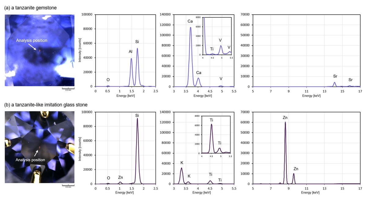 Figure 3. Optical image and XRF spectra of (a) a tanzanite gemstone and (b) a tanzanite-like imitation glass stone. The analyses were conducted using the XGT-9000 Expert with a 100 μm ultra-high intensity probe under full vacuum condition. Primary X-ray filters and X-ray tube voltages were used to reduce the undesired diffracted X-rays during the analyses.