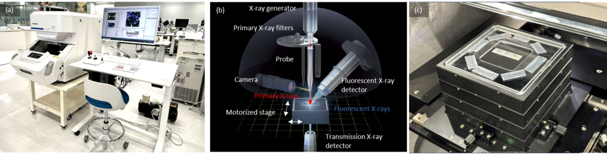 Figure 2. (a) HORIBA XGT-9000 X-ray Analytical Microscope; (b) Schematic diagram of the internal optics of the XGT-9000; (c) Multiple sample setting on a sample tray.