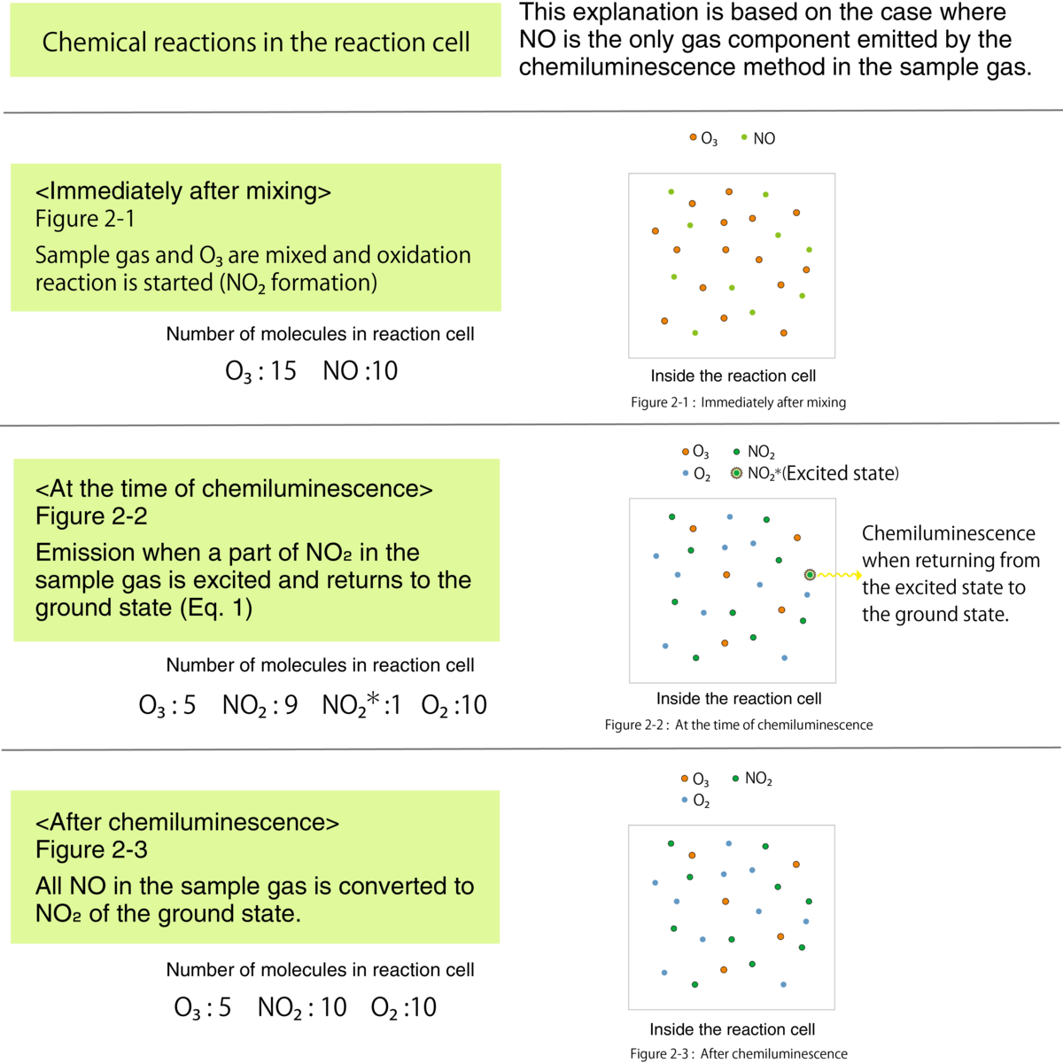 Kemilüminesans yöntemini kullanan bir gaz analizöründe, numune gazı ve O3 bir reaksiyon hücresine akar ve numune gazındaki NO ile O3 arasındaki reaksiyonun (Denklem 1) neden olduğu NO2 *'den yayılan ışık, NO konsantrasyonunu ölçmek için bir fotodetektör ile optik filtreden geçirilir. (Şekil 1)