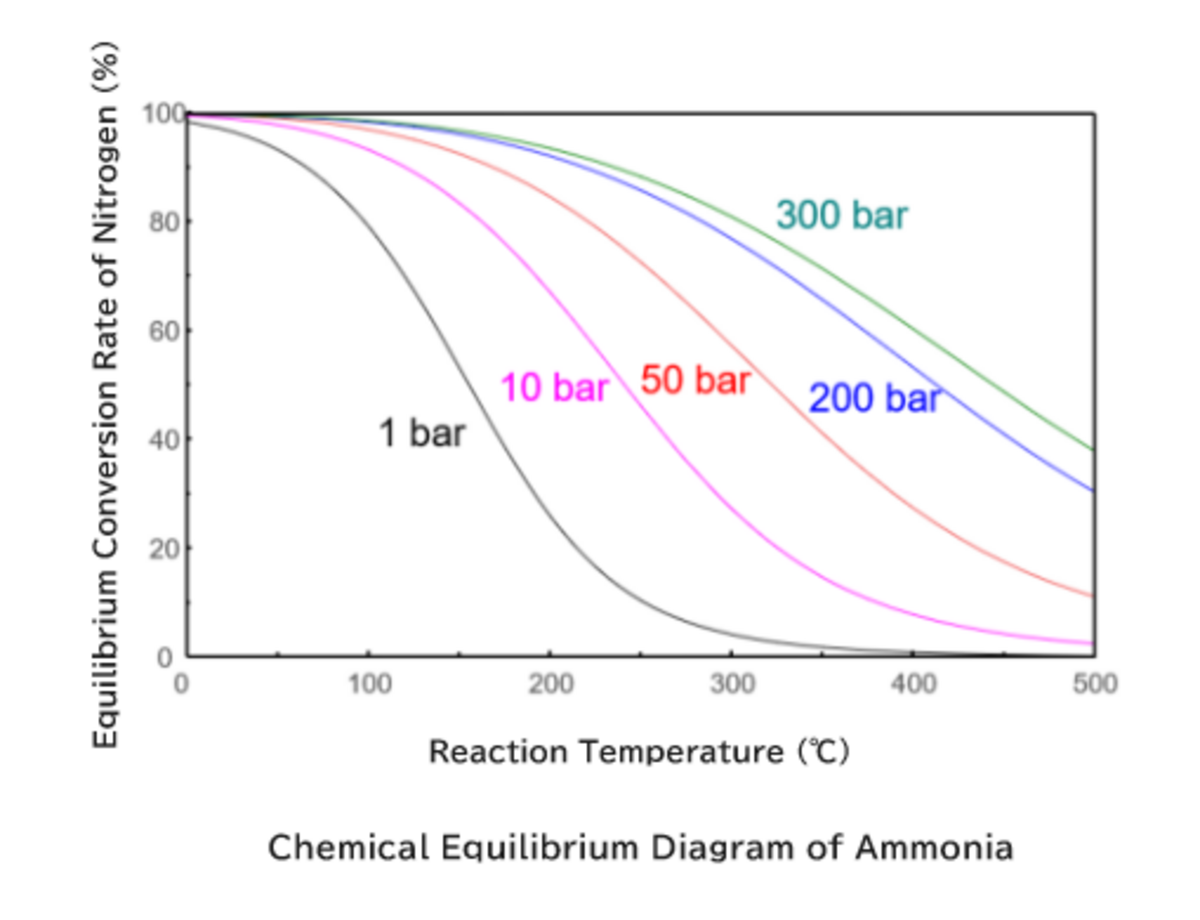 The nitrogen conversion in ammonia synthesis decreases as the temperature increases, according to the graph of equilibrium state versus temperature. Therefore, chemically, synthesis should be performed at lower temperatures. However, the iron catalyst used in the Haber-Bosch process performs poorly at low temperatures, achieving only around a 30% conversion at 500°C and 200 bar. Theoretically, higher nitrogen conversion those achieved by the Haber-Bosch process can be obtained at 300-350°C and 50-70 bar. We are conducting daily research to develop catalysts that can synthesize ammonia at lower temperatures to realize this potential.