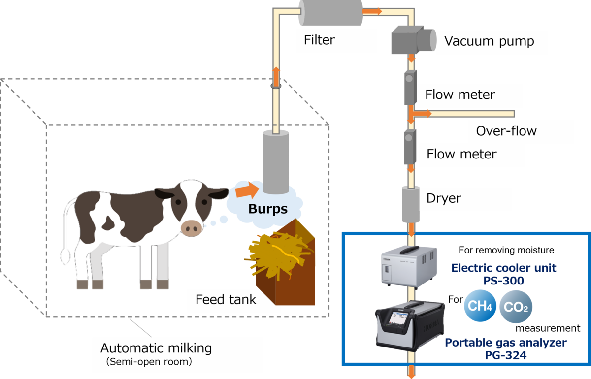 Các phương pháp đo CH4bao gồm "phương pháp buồng kín", trong đó gia súc được đặt trong một buồng kín hoàn toàn trong vài ngày, phương pháp cho ăn xanh* 3, trong đó CH4được đo trong quá trình chăn thả và cho ăn trong hộp thức ăn, và "phương pháp đánh hơi * 4", trong đó CH4được đo trong phòng bán mở trong quá trình vắt sữa và cho ăn. Phương pháp buồng kín hoàn toàn có thể đo chính xác CH4và CO2khí thải, và dữ liệu đo lường của nó được định vị là tiêu chuẩn vàng. Mặt khác, phương pháp thức ăn xanh và đánh hơi là phương pháp đo lường đơn giản sử dụng máy phân tích trong môi trường giống như trang trại, giúp đo số lượng lớn động vật dễ dàng hơn. Ngoài ra, các phương pháp này đang được chú ý vì khả năng điều tra mối quan hệ giữa CH4và CO2khí thải từ ợ hơi của gia súc và mô hình sản xuất hoặc môi trường xung quanh.