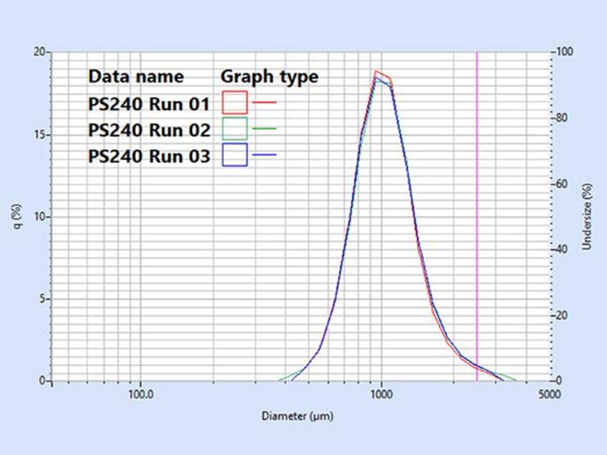 Poly-disperse glass bead standards were developed as a better test of complete system performance for laser diffraction analyzers, compared to monodisperse polystyrene latex dispersions that are not representative of most materials tested on these instruments. In this report, PS240 was tested on the LA-960V2. PS240 is a 500 µm to 2000 µm, 7-gram single shot polydisperse glass bead standard produced by Whitehouse Scientific. Repeatability for all size classes was better than 2.5%, showing great repeatability for large size particles in wet dispersions.